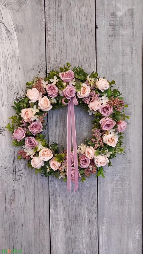 - Anyag/Összetevő művirágok, műzöldek, szalag, selyemvirágok, vesszőkoszorúalap