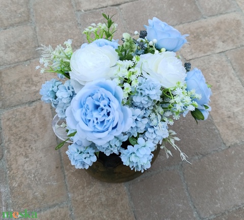 gyönyörű kék színű csokor kék és, fehér színű organza, és selyemszalag díszítéssel,