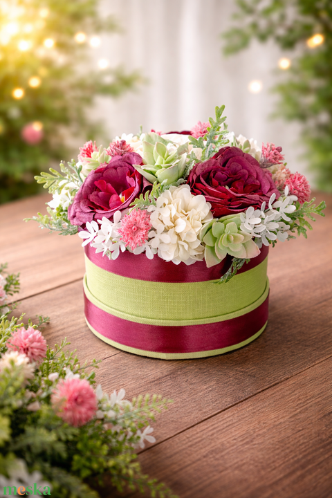 Bordó rózsás asztaldísz zöld dobozban
