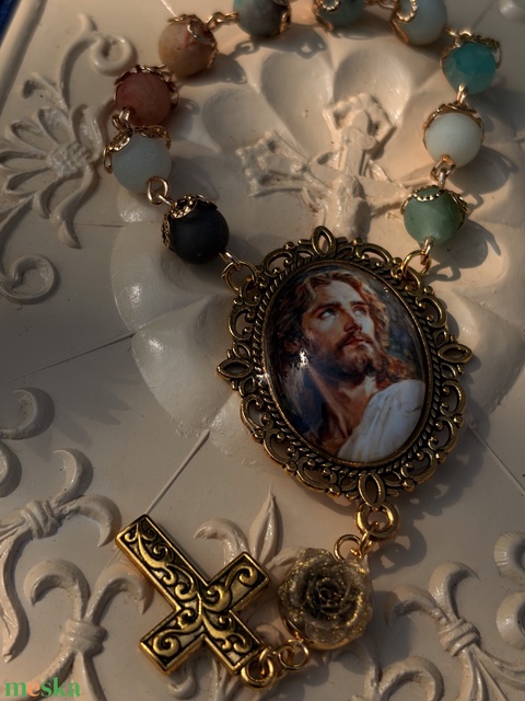 Jézust ábrázoló egytizedes olvasó amazonit ásványgyöngyökből