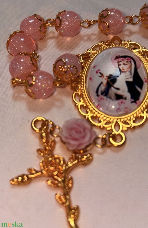 Szent Rita egytizedes, csillogó rózsaszín gyöngyökkel