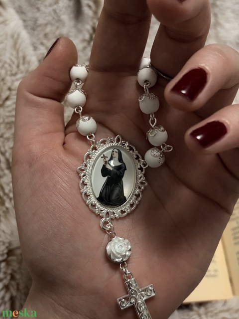 Szent Rita, egytizedes rózsafüzér fehér gyöngyökkel
