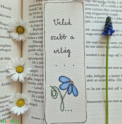 Akvarell könyvjelző - "Veled szebb a világ" felirattal, kis kék virággal