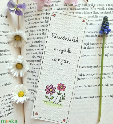 Akvarell könyvjelző - "Köszöntelek Anyák napján" felirattal, 2 - lila és rózsaszín virággal