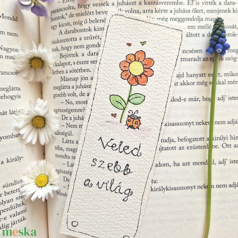 Akvarell könyvjelző - "Veled szebb a világ" felirattal, katicával, piros virággal