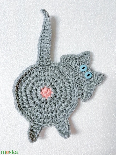 Horgolt cica poháralátét, 9–10 cm (teste). Aranyos, vicces ajándék macskakedvelőknek. Kézzel készült.