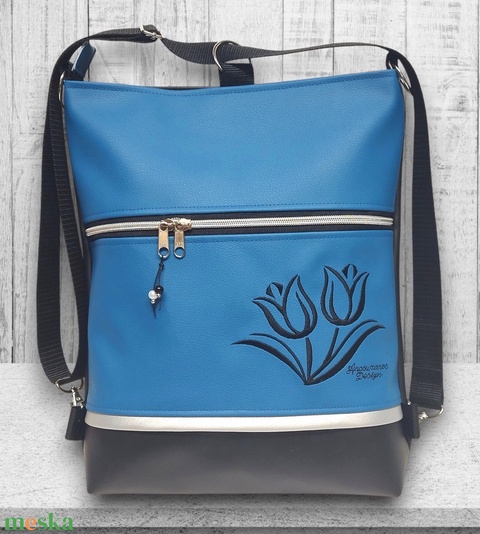 Hímzett tulipános 3in1 hátizsák univerzális táska fekete-kék