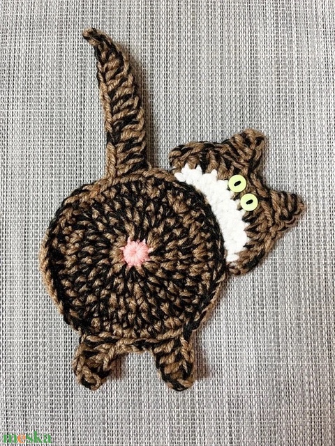 Horgolt cica poháralátét, 9–10 cm (teste). Aranyos, vicces ajándék macskakedvelőknek. Kézzel készült.