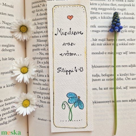 Akvarell könyvjelző - "Mindenre van erőm..." bibliai felirattal, kék virággal