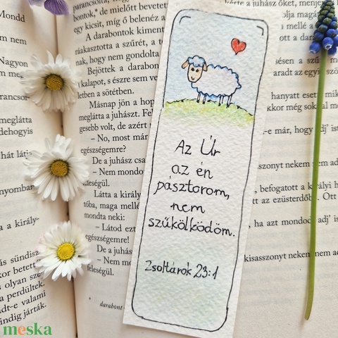 Akvarell könyvjelző - "Az Úr az én pásztorom..." bibliai felirattal, bárány motívummal
