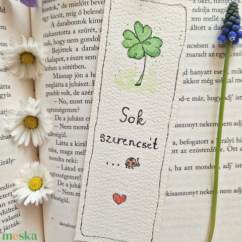 Akvarell könyvjelző - "Sok szerencsét" felirattal, katicával, lóhere motívummal