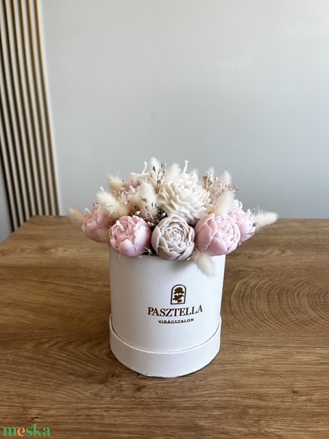 - Anyag/Összetevő szójaviasz, gyertya, szárított virág, doboz, oázis, ragasztó