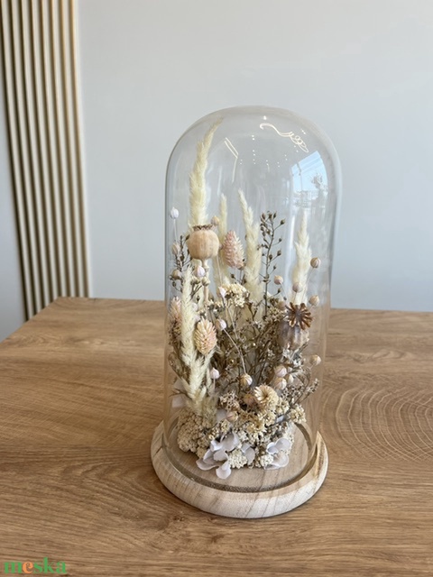 - Anyag/Összetevő szárított virág, oázis, üvegbúra, ragasztó, fa