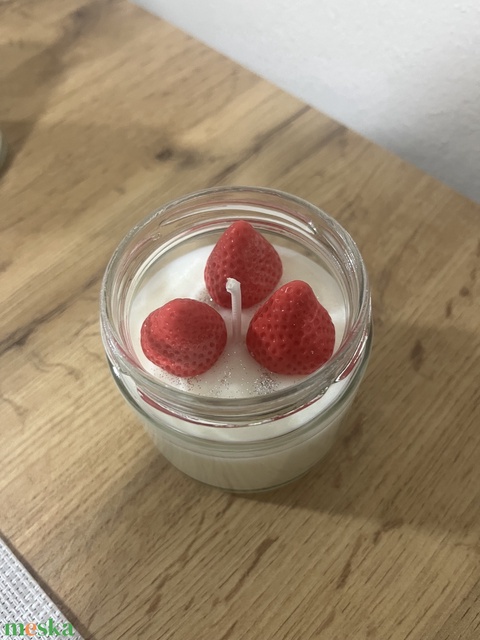 Kézzel öntött szójaviasz gyertya, amely az édes eper és a lágy vanília harmonikus illatával tölti meg a teret. A tetején elhelyezett epres díszítés még különlegesebbé és igazán szerethetővé teszi.