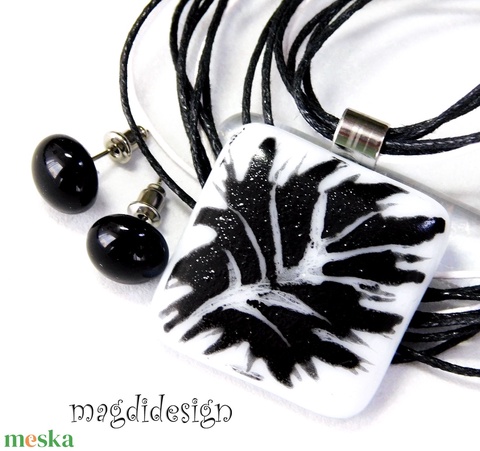 Csillogó fekete levél fehéren üvegékszer szett nyaklánc stiftes fülbevaló 1
