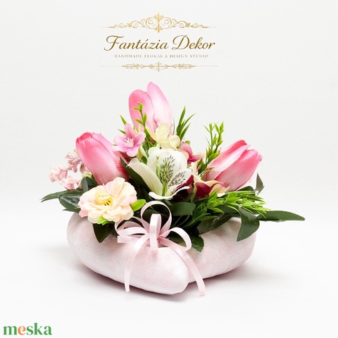 Pasztell tavaszi virágkompozíció kerámia kaspóban – kézműves dekoráció