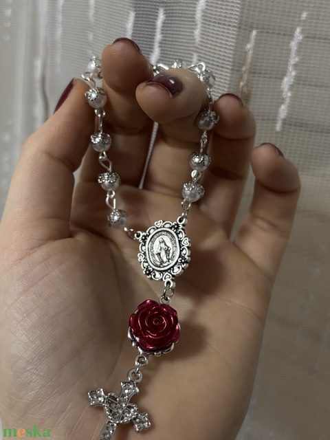 Kézműves rózsafüzér fehér gyöngyökkel.