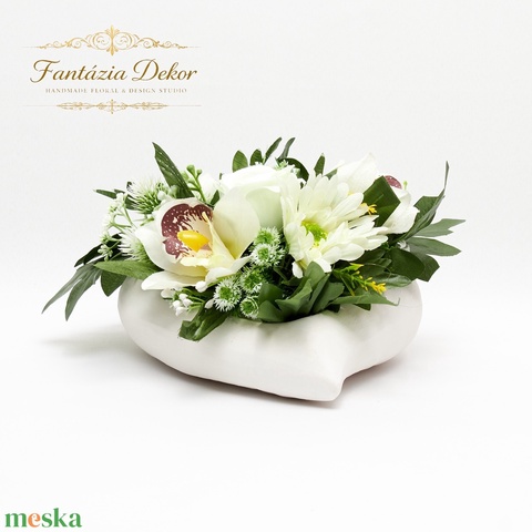 Fehér orchideás virágkompozíció kerámia kaspóban – elegáns kézműves asztaldísz