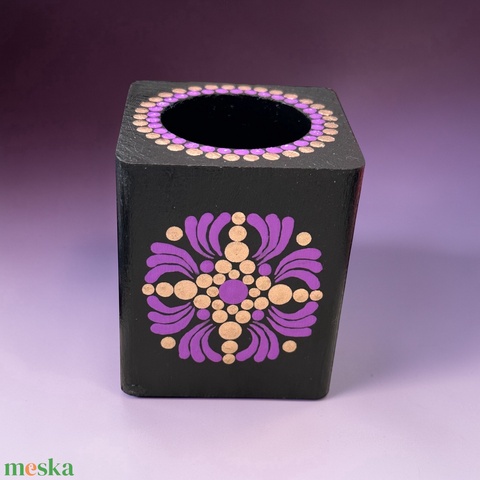 Fa mécsestartó lila és bronz színű pontmandala díszítéssel, ajándék ledes mécsessel
