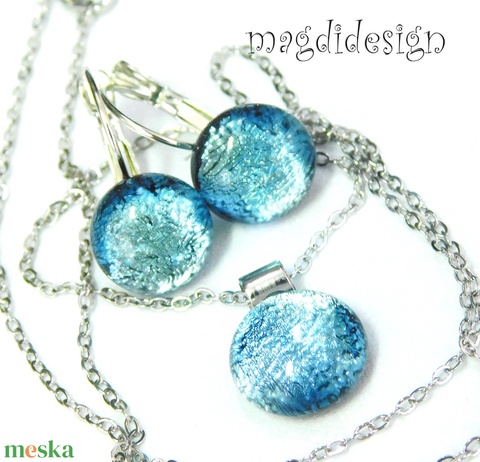 Csillogó ezüst-selyem dichroic üvegékszer szett nyaklánc, kapcsos fülbevaló