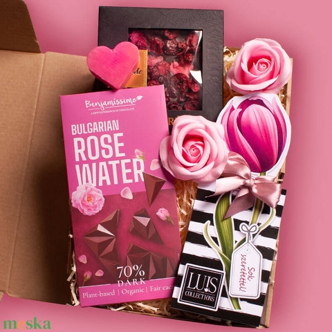 - Anyag/Összetevő díszcsomagolás, csokoládé, szappan, szappanrózsa, étcsokoládé