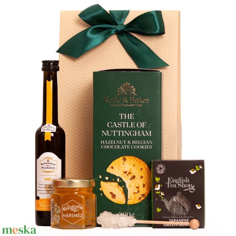 - Anyag/Összetevő díszcsomagolás, csokoládés keksz, méz, pálinka, tea