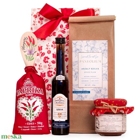 - Anyag/Összetevő díszcsomagolás, fűszerpaprika, kézműves lekvár, pálinka, aszaltszilva