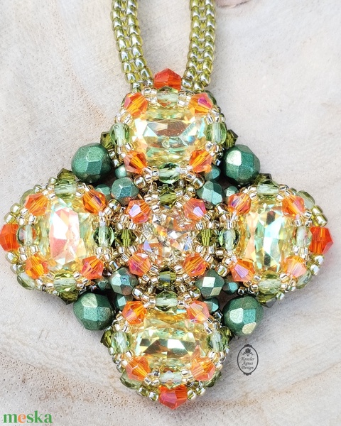 Zöld-narancs kristályos, gyöngyfűzött medálos nyaklánc – elegáns, alkalmi statement ékszer