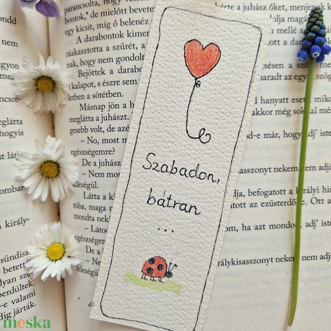 Akvarell könyvjelző - "Szabadon, bátran" felirattal, katicával, szívecskés léggömb motívummal