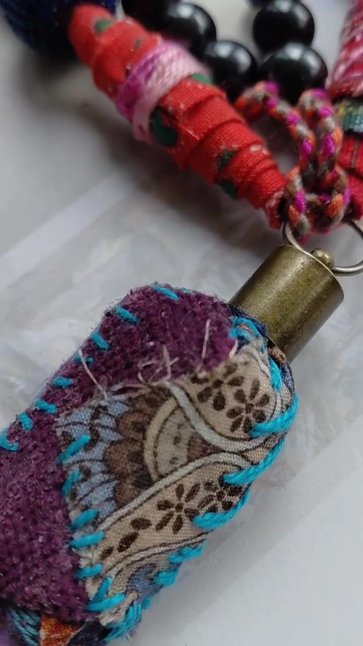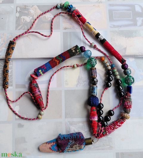 - Anyag/Összetevő textilek, pamut zsinór, üveggyöngyök, mázas kerámia gyöngyök, fekete akril gyöngyök, fagyöngy, faelem