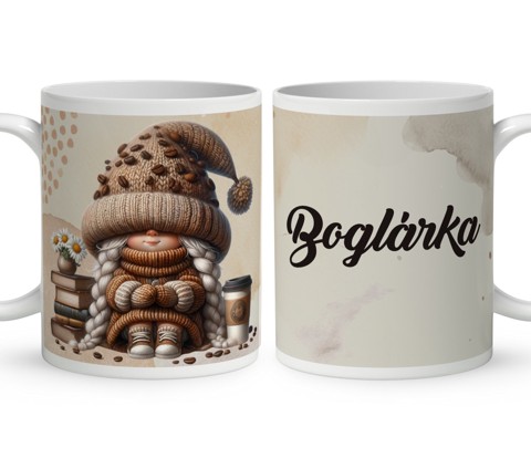 Névvel kérhető Könyvmoly kávés manó lány mintás bögre | Egyedi Ajándék Kávéimádóknak és Teázóknak | nagyoncuki.hu Képzeld el azt a mosolyt a megajándékozott arcán, amikor egy olyan bögrét tart a kezében, amely nemcsak a kedvenc reggeli kávéjához vagy teájához nyújt társaságot, hanem a kávé és a meghitt pillanatok iránti szeretetét, a reggeli rituálék fontosságát is tükrözi! Ez a különleges, egyedi tervezésű kávés manó bögre a kényelem, a nyugalom és a tudatos kávézás bájos megtestesítője, egy apró, szeretetteljes gesztus, amely a mindennapokat is fénnyel tölti meg. Kiváló ajándék ötlet kávéimádóknak és mindenkinek, aki értékeli a lelki feltöltődést egy finom ital mellett. Ez a kávés bögre a belső békét, az egyensúlyt és a jelen pillanat megélésének örömét ötvözi egy aranyos, kávézó vagy épp kávéskancsóval tüsténkedő manó figurában. Ahogy a manó elmélyül a kávézás pillanatában vagy békésen szemlélődik, nyugalmat és pozitív energiákat sugároz. Legyen szó egy frissítő napindító kávéról vagy egy esti relaxáló teáról, ez a kávés mintás bögre tökéletes társ lesz. A dizájn kedves és egyedi, tökéletes ajándék ötlet kávérajongóknak és teázóknak, akik szeretik a különleges és szívhez szóló meglepetéseket. Ezt a bájos bögrét mi magunk, a nagyoncuki.hu csapata terveztük, így biztos lehetsz benne, hogy egy igazán egyedi és különleges kávés mintás ajándék darabbal leped meg szeretteidet vagy magadat! :)