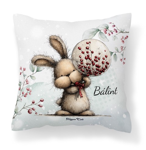 Névvel kérhető - Cuki téli nyuszi gömbbel mintás különleges és egyedi párna | Névre Szóló téli Ajándék & Téli otthon dekor | nagyoncuki.hu Képzeld el a tökéletes téli estét: kint hull a hó, bent ropog a tűz (vagy csak a radiátor duruzsol), te pedig egy forró teával a kezedben bekuckózol a kanapéra. Mi hiányzik a tökéletes kényelemhez? Egy pihe-puha párna, ami nemcsak kényelmes, de a lelkedet is simogatja! Ez a névre szóló Cuki téli nyuszi mintás párna az Erdei Varázs kollekció legölelnivalóbb darabja. A rajta lévő minta a téli erdő békéjét és az ünnepi várakozás örömét hozza el az otthonodba. A nyuszi kedves karaktere és az ünnepi környezet garancia arra, hogy ez a párna lesz a család vagy a megajándékozott új kedvence. Ez nem csupán egy lakástextil. Ez egy személyes üzenet: "Pihenj meg, érezd magad otthon, és élvezd az ünnep varázsát!". Ezt a puha, egyedi párnát mi magunk, a nagyoncuki.hu csapata terveztük, hogy az ünnepek alatt is körülvegyen a báj és a szeretet!