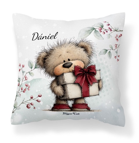 Névvel kérhető - Cuki téli maci ajándékkal mintás különleges és egyedi párna | Névre Szóló téli Ajándék & Téli otthon dekor | nagyoncuki.hu Képzeld el a tökéletes téli estét: kint hull a hó, bent ropog a tűz (vagy csak a radiátor duruzsol), te pedig egy forró teával a kezedben bekuckózol a kanapéra. Mi hiányzik a tökéletes kényelemhez? Egy pihe-puha párna, ami nemcsak kényelmes, de a lelkedet is simogatja! Ez a névre szóló Cuki téli maci mintás párna az Erdei Varázs kollekció legölelnivalóbb darabja. A rajta lévő minta a téli erdő békéjét és az ünnepi várakozás örömét hozza el az otthonodba. A maci kedves karaktere és az ünnepi környezet garancia arra, hogy ez a párna lesz a család vagy a megajándékozott új kedvence. Ez nem csupán egy lakástextil. Ez egy személyes üzenet: "Pihenj meg, érezd magad otthon, és élvezd az ünnep varázsát!". Ezt a puha, egyedi párnát mi magunk, a nagyoncuki.hu csapata terveztük, hogy az ünnepek alatt is körülvegyen a báj és a szeretet!