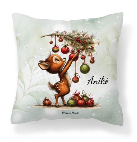 Névvel kérhető - Cuki karácsonyi őzike és a díszek mintás különleges és egyedi párna | Névre Szóló Karácsonyi Ajándék & Téli otthon dekor | nagyoncuki.hu Képzeld el a tökéletes téli estét: kint hull a hó, bent ropog a tűz (vagy csak a radiátor duruzsol), te pedig egy forró teával a kezedben bekuckózol a kanapéra. Mi hiányzik a tökéletes kényelemhez? Egy pihe-puha párna, ami nemcsak kényelmes, de a lelkedet is simogatja! Ez a névre szóló Cuki Karácsonyi őzike mintás párna az Erdei Varázs kollekció legölelnivalóbb darabja. A rajta lévő minta a téli erdő békéjét és az ünnepi várakozás örömét hozza el az otthonodba. A őzike kedves karaktere és az ünnepi környezet garancia arra, hogy ez a párna lesz a család vagy a megajándékozott új kedvence. Ez nem csupán egy lakástextil. Ez egy személyes üzenet: "Pihenj meg, érezd magad otthon, és élvezd az ünnep varázsát!". Ezt a puha, egyedi párnát mi magunk, a nagyoncuki.hu csapata terveztük, hogy az ünnepek alatt is körülvegyen a báj és a szeretet!
