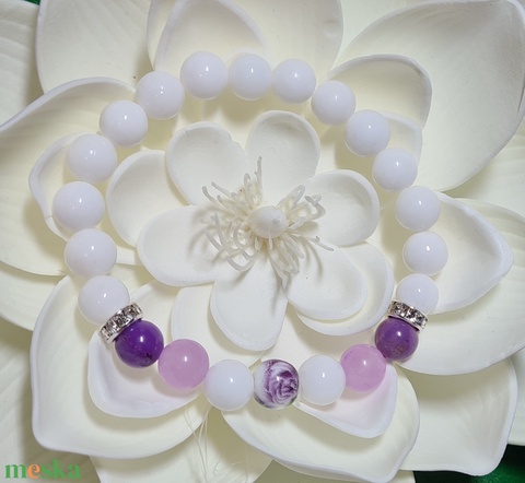 Fehér - és lila jade, festett porcelán ásvány karkötő