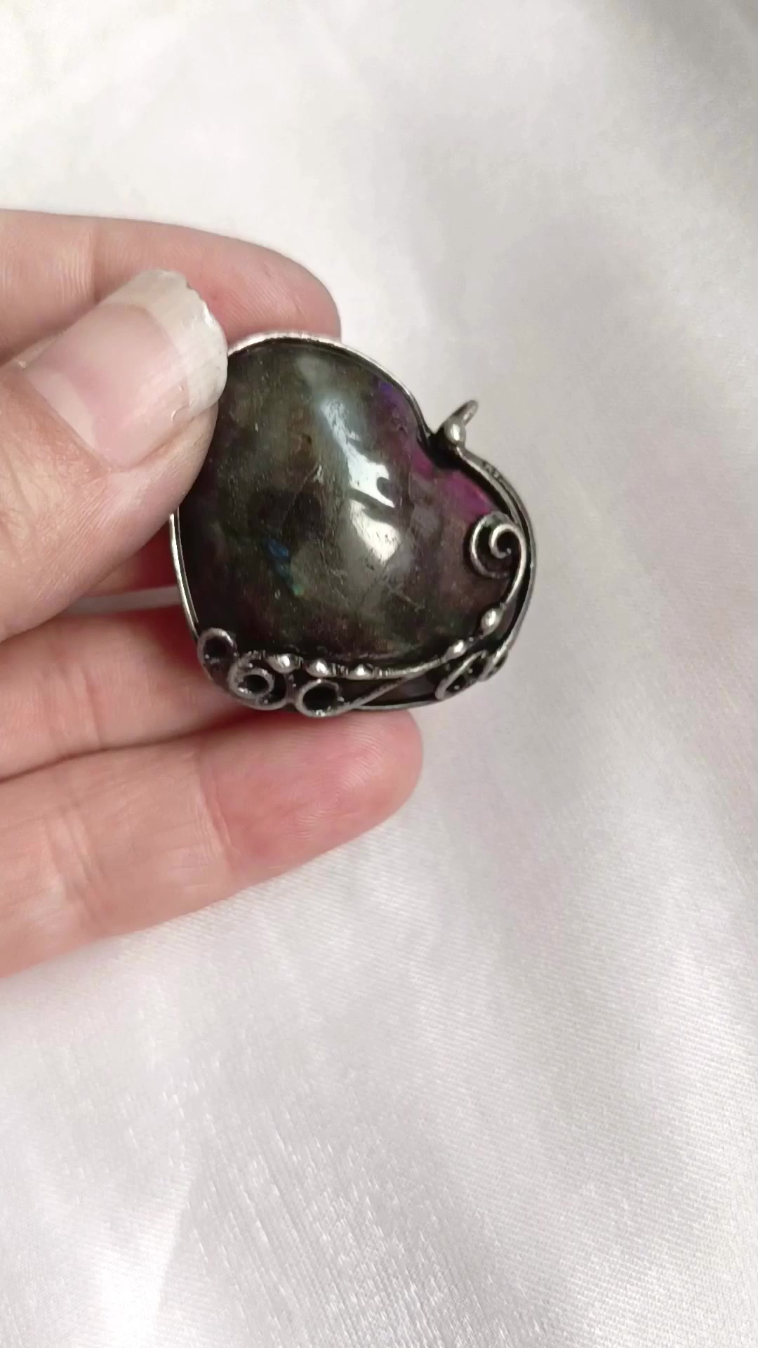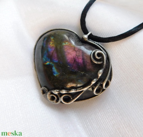 A medál Tiffany technikával készült labradorit, réz és ólommentes, ezüsttartalmú ón felhasználásával. A díszítés szintén saját készítésű, nem tartalmaz gyári elemeket. A fémrészt óezüstre patináztam és lelakkoztam, hogy sokáig szép maradjon.
