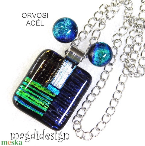 Csíkos mozaik dichroic üvegékszer szett nyaklánc, pötty fülbevaló