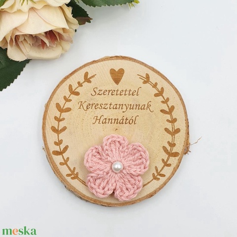 Anyák napi ajándék - Gravírozott fakorong hűtőmágnes egyedi felirattal, horgolt virágokkal