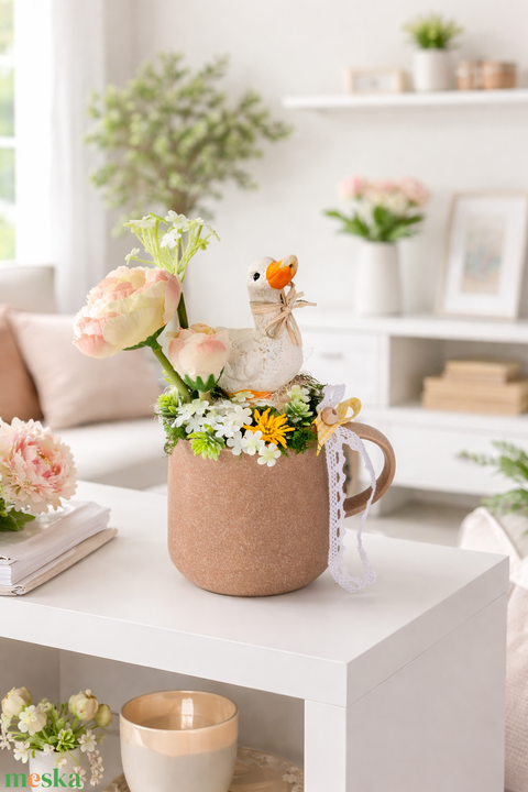 - Anyag/Összetevő bögre, selyemvirág, szalag, liba figura