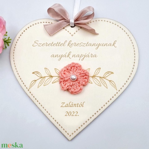 Anyák napi ajándék - Egyedi feliratos szív alakú gravírozott fa dísz horgolt virággal
