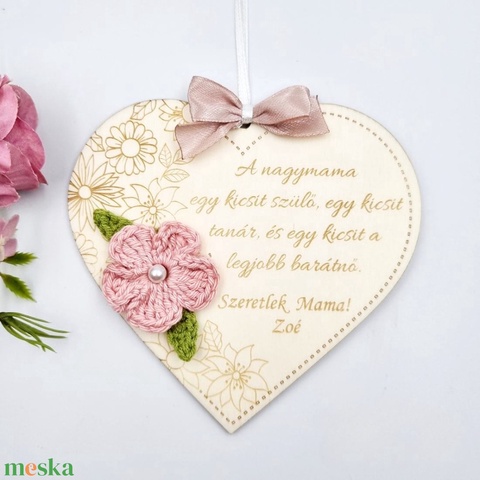 Ajándék nagymamának anyák napjára - Egyedi feliratos szív alakú gravírozott fa dísz horgolt virággal
