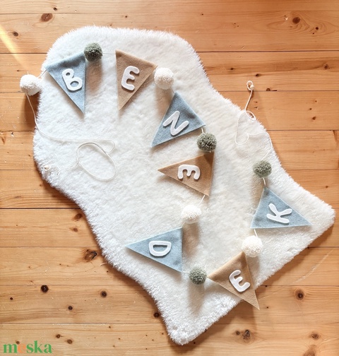 Névre szóló pompom zászlófüzér gyapjúfilcből, gyapjúfonalból készült pompomokkal (név nélkül is kérheted)