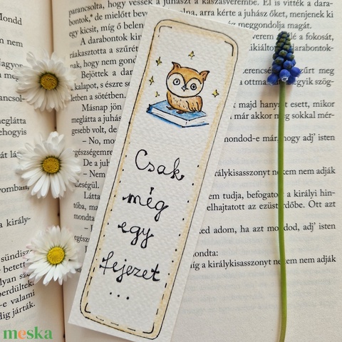 Akvarell könyvjelző - "Csak még egy fejezet..." felirattal, könyv és bagoly motívummal