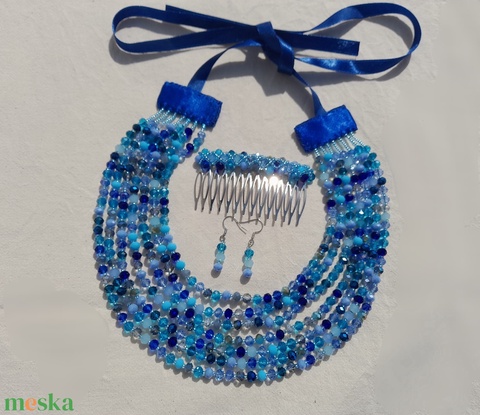 Hétsoros, kék mix csiszolt üveggyöngy kaláris szett, néptánckellék, néptáncos kiegészítő, népi ékszer