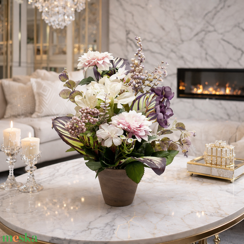 Elegáns virágkompozíció púder és lila árnyalatokkal – romantikus kézműves dekor