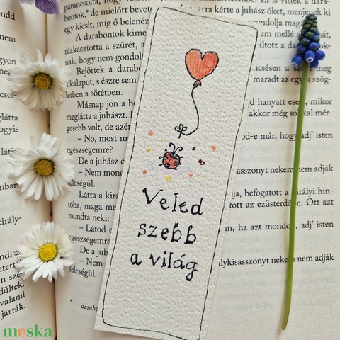 Akvarell könyvjelző - "Veled szebb a világ" felirattal, katicával, szív alakú lufival