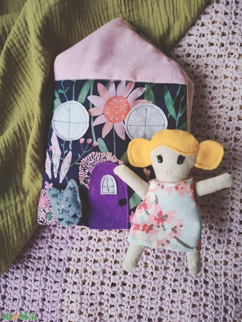 Hordozható babaház öltöztethető babával - textil babaház kiegészítőkkel - puha interaktív házikó - baba ruhákkal cicával