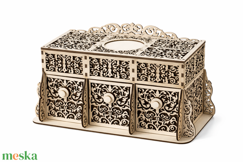 Ez a különleges, gazdagon díszített ékszertartó precíz lézervágási technológiával készült, rétegelt nyírfa alapanyagból.