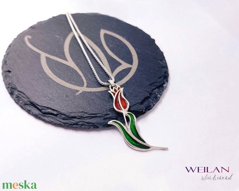 Hej'tulipán - Virágszálam ezüst tűzzománc medál piros-zöld