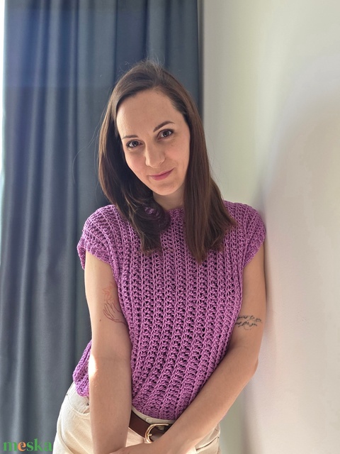 Kézzel horgolt, kötött hatású felső.